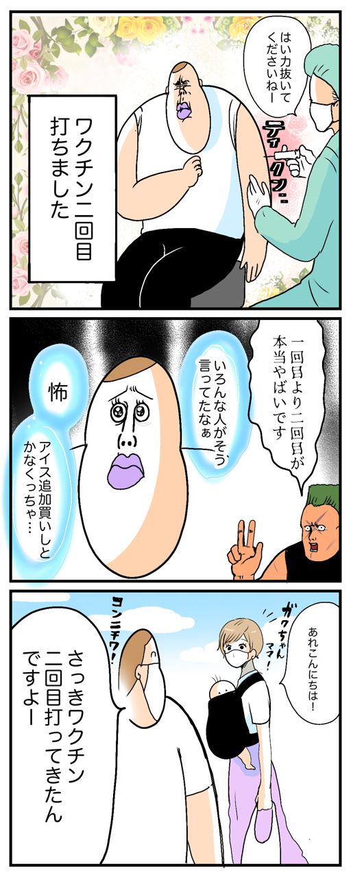 2021/10/13 😟ビビり、ワクチン2回目をうける💉 次回「さらばブブ!女の涙は一日一度きり」※ワクチンを打つ、打たないの判断は個人の事情やお考えがあって皆さん決められてると思います。その点のコメントはしないでください🙏▼1回目打った時の日記 「ブブ」カテゴリの最新記事 < 前の記事次の記事 > コメント コメント一覧 (62) 1. かほ 2021/10/13 12:01 そりゃ1回目にそれって聞いたら早く帰りなって促しちゃいますよ…… 備えがアイスなの草なんだがw 0 boobooboopiyo がしました 2. 2021/10/13 12:03 副反応辛いですよね、私も二回目大変でした💦 0 boobooboopiyo がしました 3. ププ 2021/10/13 12:04 …ゴクリ(;゚д゚゛) 0 boobooboopiyo がしました 4. サーシャ 2021/10/13 12:08 本当に一日半動けなかったので、無理なさらず。食欲なく、ポカリ4本飲みましたけどまだ足りない感じでした。お大事に、、 0 boobooboopiyo がしました 5. 2021/10/13 12:08 この後どうなったのかドキドキ!!今週末2回目打つのでガラスのハートの私はガチガチです… あぁ嫌だな。 0 boobooboopiyo がしました 6. みみー 2021/10/13 12:08 大ファンです。いつも楽しみにしてます😊 私も明日が2回目ワクチン接種なんです〜 しかも、かなりのビビりで…😞 有給も2日取りました。冷蔵庫にも食材パンパンにするつもりです。職場の同僚もお多福みたいに顔面半分腫れました😱怖いです〜🥺 0 boobooboopiyo がしました 7. ふえた 2021/10/13 12:09 2回目しんどいって凄い聞くけど私2回目打ったあと腕の痛みすら1回目より軽くて熱も何も出なかくてすこぶる元気だったんですけど本当にワクチン効いてるのか…… 0 boobooboopiyo がしました 20. ハチ 2021/10/13 12:46 >>7 アッ!私も同じです! 全く熱も出なくて、腕の痛みも一回目ほどじゃありませんでした‼︎ 逆に不安になりますよね…。 0 boobooboopiyo がしました 22. シャケ 2021/10/13 12:55 >>7 私も同じです。 人それぞれなので気にしないでいましょう。 0 boobooboopiyo がしました 23. ななし 2021/10/13 13:00 >>7 私もです。 そして2回目接種から約3週間後にコロナ陽性になりました…。 0 boobooboopiyo がしました 24. まるこ 2021/10/13 13:25 >>7 私も副反応なしです… 私の周りではお酒の強い人が副反応なしのような←たぶん違う 0 boobooboopiyo がしました 8. みるく 2021/10/13 12:11 1人目よりも2人目の時の方が。。 産む産まない何人産むかは それぞれの事情やお考えがあって決められてると思います。その点については反論しないでください。 0 boobooboopiyo がしました 9. たろぷぶっ 2021/10/13 12:13 赤ちゃんの髪の毛3本ウケた(๑>◡<๑) 0 boobooboopiyo がしました 10. もぐらまん 2021/10/13 12:14 備えが「アイス追加買いしなきゃ」なのが最高!w 0 boobooboopiyo がしました 11. アイスは大事 2021/10/13 12:14 いつも楽しく読ませていただいてます! わたしも2回目は3日ほど熱が出ましたが、なぜか食欲はまったく減退せず、38度の熱でフラフラしながらも妙にステーキが食べたくて悶々としていました。笑 0 boobooboopiyo がしました 41. まる 2021/10/13 16:50 >>11 すごく共感🤔 私も38℃あったのに濃い味噌ラーメンが食べたくて仕方なかったです。 ゼリーやアイスは用意しても濃い味の用意がなかったから辛かったなぁ😔 0 boobooboopiyo がしました 12. ころころ 2021/10/13 12:16 周りから2回めの方がやはり副反応強いと聞くので、ブブさん無理なさらずゆっくり休んでくださいねー! ウチの旦那も明日2回め接種の予定です。 本人はケロっとしてますが、私の方が心配でドキドキです・・。 0 boobooboopiyo がしました 13. 宇宙海賊ヤマカガシ 2021/10/13 12:20 緑のモヒカンがヤバい^_^ 0 boobooboopiyo がしました 14. miho 2021/10/13 12:28 「さらばブブ!」は嫌~~~ さよならしたくない~~~ 0 boobooboopiyo がしました 15. ayashi 2021/10/13 12:33 ぶぶちゃん、私2回目まだだから怖いよ ぶぶちゃんの副反応どーなるかドキドキしながらお知らせ待っとるねw 0 boobooboopiyo がしました 16. ももも 2021/10/13 12:38 接種前も接種後もとにかく水をいっぱい飲むと良いと聞いて実践したら、1回目より副反応なかったですよー! 本当にそれが効いたのかわからないけどこれからの人は是非試してみてください(^◇^) 0 boobooboopiyo がしました 17. ちろぺた 2021/10/13 12:38 熱だしたら家事と育児を旦那にまかせてずっと布団で寝てられる!ってドキドキしてたんですけど…私は2回目も元気でした…。 0 boobooboopiyo がしました 28. うう 2021/10/13 14:28 >>17 任せられる旦那さんがいらっしゃって羨ましい!私、もうすぐ2回目なんですけど、副反応がどれだけ強いかよりも、しんどくてもその状態で家事と子育てやらなきゃいけない状況なのでそれを考えるだけでもうしんどい… 寝てたら治る…って寝れないんですけどお!という感じで 0 boobooboopiyo がしました 46. すす 2021/10/13 18:14 >>28 レンタル!レンタルDVD借りまくるか、どこか契約してテレビざんまいにして、 冷凍食品、レトルト食品買い込んでとにかく火を使わないでレンジ様でどうにかなるものを買いだめして備えて下さい(涙) お子さんがおいくつかにもよりますが、