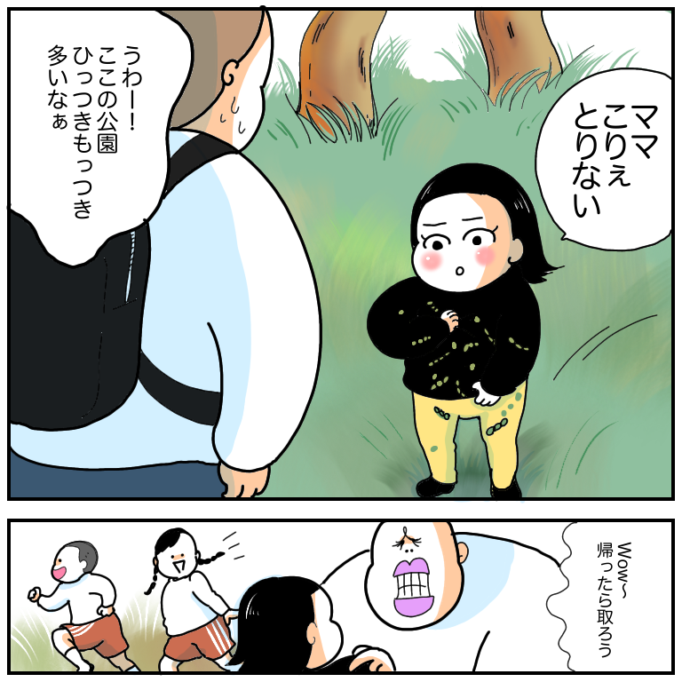 オナモミなら取りやすいけど、小さい種みたいなやつは取りにくいし、黒っぽい棒状のひっつき虫も取りづらい!!