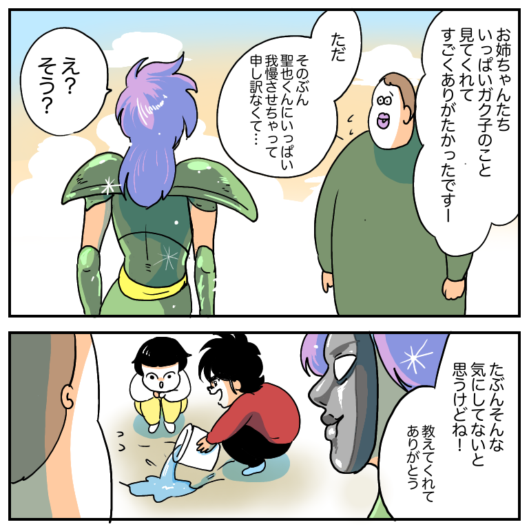 2020/03/26 燃えあがる!4歳の戦士!第一話 第二話へ続くちなみにお姉ちゃんたちとの出会いはこちら↓ 「ガク子」カテゴリの最新記事 < 前の記事次の記事 > コメント コメント一覧 (109) 前のコメントを読み込むためにはJavaScriptを有効にしてください。 読み込み中 46. ななし 2020/03/26 20:34 >>38 優しさのコスモパワー!!! 0 boobooboopiyo がしました 75. 2020/03/26 23:57 >>38 こういうコメントできるの憧れる 0 boobooboopiyo がしました 84. コスモ 2020/03/27 05:07 >>38 さすがブブさんの読者、、 レベル高ぇ、、、 0 boobooboopiyo がしました 88. らるる 2020/03/27 08:04 >>38 ぶぶさんのブログで笑いそのあとのこのコメントで最高のオチを頂きましたwwwwwwww 0 boobooboopiyo がしました 89. ぱりんこ 2020/03/27 09:58 >>38 大きくなったら>>38みたいになりたい 0 boobooboopiyo がしました 101. 通りすがり 2020/03/27 23:56 >>38 優しさの小宇宙というパワーワード 0 boobooboopiyo がしました 104. 菜 2020/03/29 10:14 >>31 >>38みたいに言えるといいね 0 boobooboopiyo がしました 81. 小宇宙(コスモ)が爆発しそう 2020/03/27 00:49 >>5 あれ名前が…と思ったら ママ(シャイナさん)登場で理解しましたw ほんとすき🤣 0 boobooboopiyo がしました 6. ママケーキ 2020/03/26 19:05 シャイナママwww 0 boobooboopiyo がしました 7. うめ 2020/03/26 19:06 一瞬、魔鈴さんかと思いきやシャイナさん! 0 boobooboopiyo がしました 8. ミナミ 2020/03/26 19:07 聖也くん可愛い(●´ω`●) お母さんも個性的で笑笑 このシリーズ大好きです💓💞 0 boobooboopiyo がしました 9. うーまま 2020/03/26 19:07 いつも楽しみに見てます♡ いや聖闘士星矢世代だからウケまくりました笑! 颯爽と現れるシャイナさん…いや聖也くんママ笑! ブブさんもあちらの保護者にそんな声掛けできるなんて素敵なママ♡ 0 boobooboopiyo がしました 10. ふじさん 2020/03/26 19:07 お母さんどんなキャラかめっちゃ気になります!! 0 boobooboopiyo がしました 11. いな 2020/03/26 19:08 あのママが誰か気になりすぎて調べちゃった(笑)蛇使い座のシャイナ(笑) 0 boobooboopiyo がしました 12. まやまり 2020/03/26 19:11 本当に面白すぎ…特に小学生シリーズ大好きです❤️ 0 boobooboopiyo がしました 13. 鳥 2020/03/26 19:13 え、お姉さんが星華姉さんじゃない… 0 boobooboopiyo がしました 14. あんこ 2020/03/26 19:18 マーマ呼びw 黄金期ジャンプのエッセンスいっぱいでニヤニヤしちゃいます 0 boobooboopiyo がしました 15. ささら 2020/03/26 19:20 なるほど、せいやくんママはシャイナさんだから、せいやくんパパに素顔を見られたんですね。 今まですっっかり忘れた聖闘士星矢の思い出が脳をギュンギュン駆け回るww 0 boobooboopiyo がしました 16. らん 2020/03/26 19:24 ひとりひとりのキャラが濃くて いろいろ渋滞しとる(笑) 0 boobooboopiyo がしました 17. ちぇりお 2020/03/26 19:28 いつも楽しみにしてるんですが、こんなに続き気になるの初めてですwww 0 boobooboopiyo がしました 18. もりしー 2020/03/26 19:32 やばい! 絶対に感動しそう🥺 0 boobooboopiyo がしました 19. 父はカシオスか? 2020/03/26 19:34 くっ、心の中でペガサス幻想が…! セッ…セィッセイヤー! 0 boobooboopiyo がしました 20. モカ 2020/03/26 19:38 聖闘士星矢(爆笑) タッチが素敵すぎて…第二話が楽しみすぎます 0 boobooboopiyo がしました 21. ナユ 2020/03/26 19:41 ゲラゲラꉂꉂ(๑˃▿˂๑)ꉂꉂ(๑˃▿˂๑)ꉂꉂ(๑˃▿˂๑) 大爆笑してしまった🤣🤣🤣 ママンちょーわろた🤣🤣🤣 0 boobooboopiyo がしました 22. ポーラ 2020/03/26 19:41 聖也くんだから聖闘士星矢風なのね(´^∀^`) 0 boobooboopiyo がしました 23. そーたママ 2020/03/26 19:43 あかんwww 笑いを堪えきれんwww 0 boobooboopiyo がしました 24. まな 2020/03/26 19:44 戦士たちシリーズが好きすぎて😍笑 聖也くんも4歳にしてしっかりしている…! 0 boobooboopiyo がしました 25. イム子 2020/03/26 19:47 いつも楽しみに読ませて頂いています☺︎ 今回はマジ、小宇宙が燃えました!笑 0 boobooboopiyo がしました 26. みき 2020/03/26 19:49 せいやくんのお母さんの絵面www 0 boobooboopiyo がしました 27. 公園戦士ラブ 2020/03/26 19:50 なんて素晴らしい画力!!いつも面白くて大好きです!!! 0 boobooboopiyo がしました 28. かえぎゅ 2020/03/26 19:50 聖闘士星矢感が😂 0 boobooboopiyo がしました 29. たま 2020/03/26 19:50 戦士一家!(゚∀゚)笑 0 boobooboopiyo がしました 30. アフロディーテ 2020/03/26 19:53 遂にこの時が来た感じです! 読んでる時12星宮編の前回のあらすじ時の音楽流れてましたw 0 boobooboopiyo がしました 32. ほりお 2020/03/26 19:58 ちょwwwwwwセイヤくんママのキャラ設定wwwwwwww 0 boobooboopiyo がしました 33. ジュネ 2020/03/26 20:02 お母さんがジャイナさん!! 0 boobooboopiyo がしました 34. 聖也くんのママ 2020/03/26 20:04 魔鈴さんじゃないすかwwwwwww 0 boobooboopiyo がしました 35. えむ 2020/03/26 20:05 魔鈴さんですかwww 聖闘士星矢ネタがいつもグッときます!🤣🤣🤣 0 boobooboopiyo がしました 36. えむ 2020/03/26 20:06 >>35 違いました!これはシャイナさんですね!🤣🤣🤣 0 boobooboopiyo がしました 37. さよんじゅん 2020/03/26 20:13 星也くんのおかーさんやばい!かっけぇ🤣🤣 いつも仕事帰りの癒しですー😂 0
