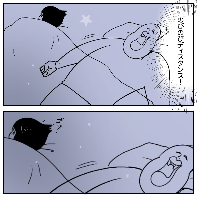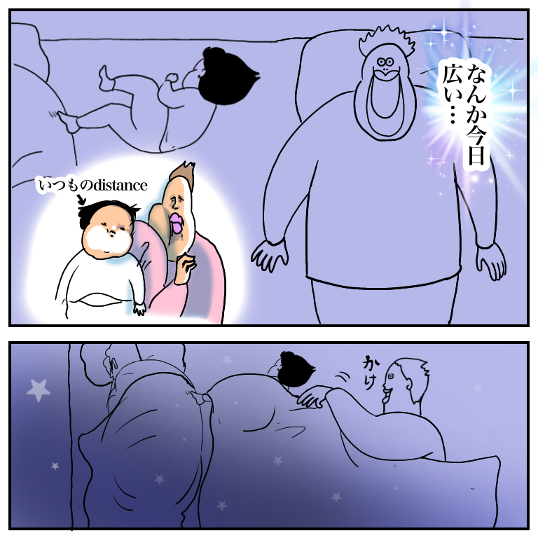 双子が寝静まったら私が頭の向きを180度反対にして、少しでも広々ディスタンスを楽しみますが深夜になるとゾンビのように私の枕元にムギュムギュやって来て、結局は狭すぎディスタンスになります…