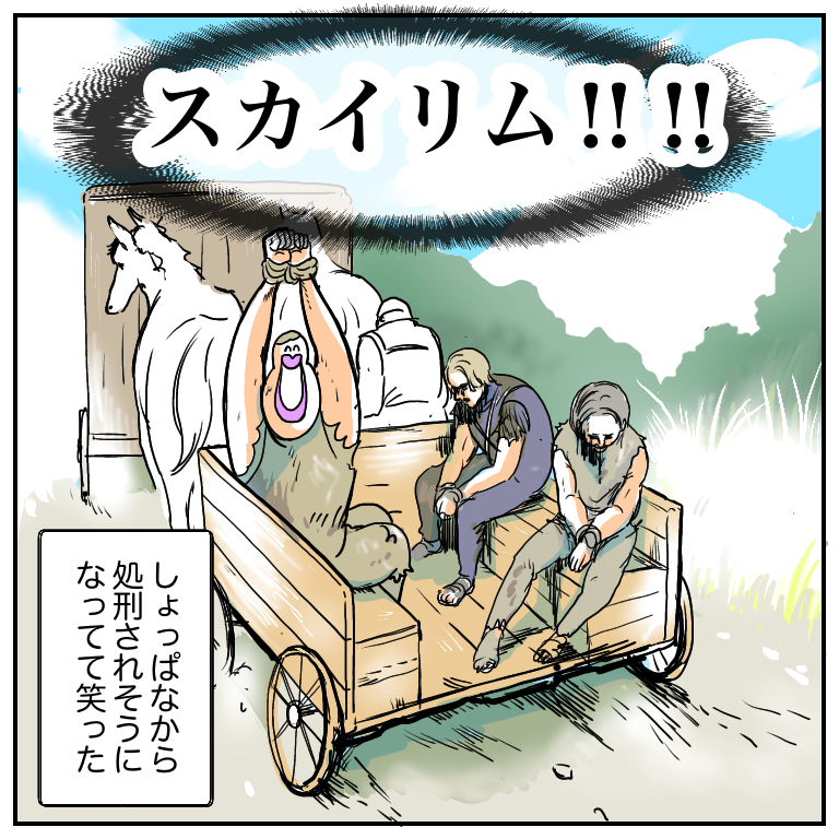 スカイリムは最初の馬車のシーンでバグがよく起きますwそのバグがとても毎回笑えるので出会えたら是非漫画にしてほしいです!