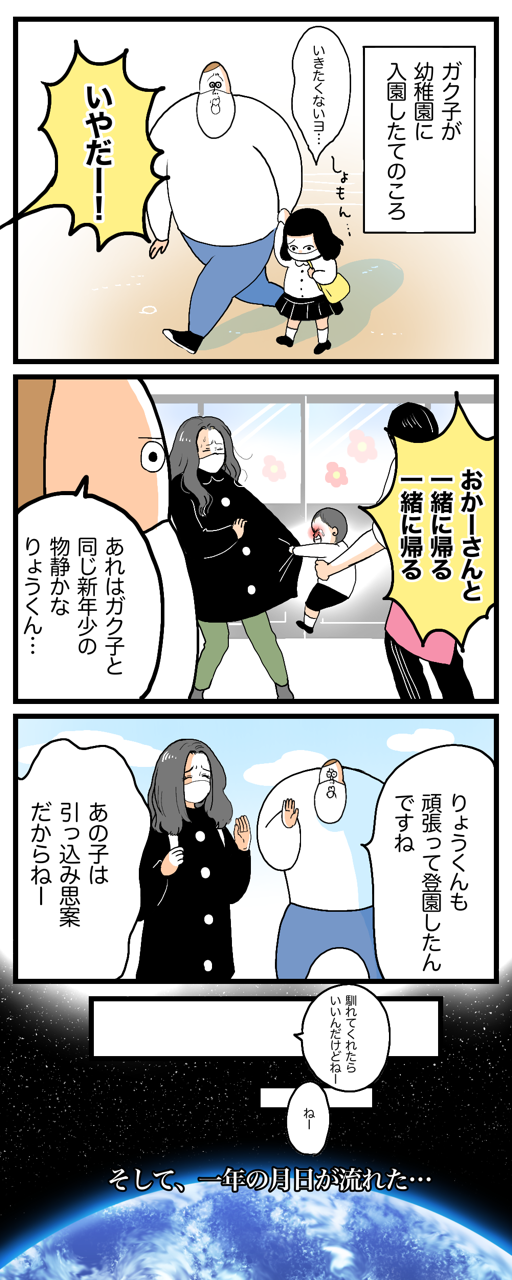 2021/04/19 🛡年中さんにグレードアップした戦士たちの様子⚔ 年中になり、ガク子もお友だちも皆登園の仕方が堂々としてて最高な感じです⚔🛡▼前回 いつもコメントありがとうございます🌸「パパは何故1人で敷布団で寝てるの?」とご質問いただきましたがもう物理的にダブルベットに家族三人でゆったり眠れないからです🐪👍▼ガク子が幼稚園始まった頃のまんがも良かったら 「ガク子」カテゴリの最新記事 < 前の記事次の記事 > コメント コメント一覧 (87) 1. メメ 2021/04/19 12:01 ヒューに笑いました 0 boobooboopiyo がしました 2. かほ 2021/04/19 12:02 ヒュゥ~✴️またひとり、戦士になりましたね✨うちの娘もいつか戦士になるのかな……😏 0 boobooboopiyo がしました 3. ななこ 2021/04/19 12:02 ヒュ〜w 0 boobooboopiyo がしました 4. ミーコ 2021/04/19 12:03 ヒュー! かっこいい!! 0 boobooboopiyo がしました 5. 🥕 2021/04/19 12:03 ヒュ〜♪ カックイイぜ!かっこよすぎるぜ年中戦士‼️ 0 boobooboopiyo がしました 6. うにゃち 2021/04/19 12:05 スラムダンク最終巻を思い出しました(笑) 0 boobooboopiyo がしました 7. もしゃ 2021/04/19 12:05 groovy!!!!!!(☆w☆) 0 boobooboopiyo がしました 8. あくび 2021/04/19 12:07 みんなこうやってお兄ちゃんお姉ちゃんになっていきますね☺️ ニッコリしちゃいました(笑) 0 boobooboopiyo がしました 9. サイコ 2021/04/19 12:07 心に撃つね~ 0 boobooboopiyo がしました 10. ぷぷぅ 2021/04/19 12:08 かっこいいww たくましく育ってよかったww そして卒園式で思い出して泣くやつ😭 0 boobooboopiyo がしました 11. いけ 2021/04/19 12:08 爆笑w 子供たちも1日1日を積み重ねて、自分に自信を持っていくんですね。かっこいいぜ〜!! 0 boobooboopiyo がしました 12. かぼちゃん 2021/04/19 12:14 ヒュ〜、 今日も楽しくなる漫画ありがとうございます! 卒園まで毎朝泣き通した揺るぎない戦士もおりましたよ、なんなら入学してからも涙目登校 周りから愛されてます。 頑張り中の親子さん、お疲れ様です!ヒュ〜 0 boobooboopiyo がしました 13. おにやま 2021/04/19 12:15 まじかっけぇーりょうくん 0 boobooboopiyo がしました 14. 面白い 2021/04/19 12:18 マスクも飛んでいったみたいですね😸 0 boobooboopiyo がしました 15. ひなまま 2021/04/19 12:19 まさに三女が四月で新年少さんになり、行きたくないーっと毎朝泣いているので一年後を楽しみに頑張ろうと思います🥺❤️ 0 boobooboopiyo がしました 16. モイモイ 2021/04/19 12:20 ブブさんビックリしすぎてマスク取れちゃった?(笑) 0 boobooboopiyo がしました 17. がくちゃんのイマジナリー親戚おじさん 2021/04/19 12:21 男子は心にSLAM DUNK最終巻を持ってますからね。ヒュ~ 0 boobooboopiyo がしました 18. ドルジ 2021/04/19 12:33 息子が慣らし保育で1人大泣きしていて、 落ち込んでいたのですが、 いつか戦士になる日を夢見て 親子で頑張ります! 0 boobooboopiyo がしました 19. Yuki 2021/04/19 12:41 ヒュ〜! 最高です! ホント描き方が大好き‼️ お母さんにすがる姿、我が子は3人とも見せてくれませんでした🥲 うちの末っ子長女年少戦士は貫禄ありすぎて、一度も泣かない挙句、先生に滑り台の使い方を注意されたら、「もう!嫌い!」と言ってマスクを地面に投げつけたらしいっす。 強烈〜!!! 0 boobooboopiyo がしました 20. ゆの 2021/04/19 12:41 いつも応援しております 私も子供関係の仕事をしていて 離れたくないと大泣きしていた子が 今では一丁前に私に指示してくるまでに成長しました。子供って面白いですよね^_^ 0 boobooboopiyo がしました 21. リーリエ 2021/04/19 12:41 ガクちゃんもりょうくんも素晴らしい✨ うちの息子は年中さん三学期でやっと りょうくんみたいに登園してくれるように なったなぁ。懐かしい。 0 boobooboopiyo がしました 22. 春子さん 2021/04/19 12:46 流川と桜木を思い出しました😂笑 0 boobooboopiyo がしました 23. よしこ 2021/04/19 12:47 歯磨きしながら読んでたら全て吹き出しました 0 boobooboopiyo がしました 24. わわわ 2021/04/19 12:47 りょうくん、ガク子ちゃん 最&高だよ👍 これからも健やかに❣️ 0 boobooboopiyo がしました 25. えり 2021/04/19 12:54 ハイタッチの仕方イケメン〜ヒュ〜 0 boobooboopiyo がしました 26. しまこ 2021/04/19 12:55 さいくぅ~~~~~!! 0 boobooboopiyo がしました 27. はるちゃん 2021/04/19 12:57 マンガ読んでると、登場してる人と同じ表情しちゃう私氏… ヒュー♪の時、ヒュー♪の顔したわ…🤣 0 boobooboopiyo がしました 28. ゆっこ 2021/04/19 12:57 スラムダンク(笑) みんなそうやって大人になっていくんですね✨ 0 boobooboopiyo がしました 29. コロコロちゃん 2021/04/19 12:58 劇場タッチが面白すぎて😂😂❤️❤️爆笑 0 boobooboopiyo がしました 30. ムー眠ママ 2021/04/19 13:00 うちは、逆に年長になってから毎朝ギャン泣きですよ、、、泣 0 boobooboopiyo がしました 31. ひゅ~ 2021/04/19 13:01 うちは、セミダブルに3人で寝てるんだ(笑) 0 boobooboopiyo がしました 32. 髭親父 2021/04/19 13:17 | ´ω`).。oO(ヒュ〜♪ 突然のコブラ笑った) 0 boobooboopiyo がしました 33. いなこ 2021/04/19 13:27 絵のレベルの高さよ 0 boobooboopiyo がしました 34. あはは 2021/04/19 13:35 お父さん