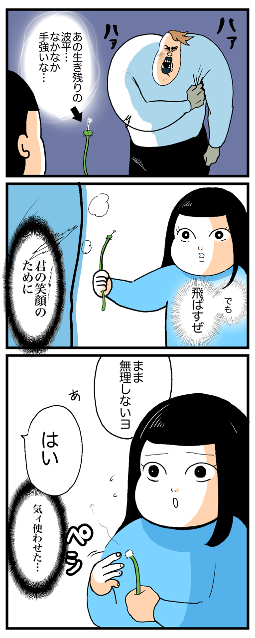 2021/05/02 🍃恐れもッ弱さもッたんぽぽもッ!吹き飛ばせ!🍃 たんぽぽの綿毛をひと吹きで飛ばせるそういう肺活量がわたしはほしい🐘▼前回連載の感想ありがとうございます😭前回シリーズから読んでくれてた方もいるみたいで、本当に嬉しい!いただいた感想コメントを見ながら続きもがんばって描きます🙏 「ガク子」カテゴリの最新記事 < 前の記事次の記事 > コメント コメント一覧 (26) 1. すーみん 2021/05/02 12:02 生き残りの波平(笑) 言葉のチョイスが本当に面白いです! ガクちゃんどんどんお姉さんになってきてますね。 0 boobooboopiyo がしました 2. かほ 2021/05/02 12:02 生き残りの波平(笑)気遣いができる系女子ですね、がくちゃん❤️あっさり生き残りの芽を摘んだけど(笑) 0 boobooboopiyo がしました 3. みかん 2021/05/02 12:17 波平で爆笑でした笑笑🤣 0 boobooboopiyo がしました 4. まっちゃ 2021/05/02 12:49 私も肺活量はないけど、鼻息が荒くて普通に目の前に書類置いてるだけで吹き飛ばす威力持ってるから、がくちゃんのために鼻息を貸したいです😭😂 0 boobooboopiyo がしました 5. ななし 2021/05/02 12:56 綿毛って、肺活量じゃなくて、風を当てる角度の問題じゃないかと。 0 boobooboopiyo がしました 6. かまかま 2021/05/02 12:59 最近はガクちゃんがツッコミ役になってますねwwww 0 boobooboopiyo がしました 7. 🥕 2021/05/02 13:02 波平wwwww ブブさんの心境とガクちゃんの反応がシュールで面白すぎます🤣 0 boobooboopiyo がしました 8. ブブファン 2021/05/02 14:02 インスタストーリーの 更新しました画像で もう絶対面白いやんって 飛んで来たけど やっぱり期待通りでした🤣💗 0 boobooboopiyo がしました 9. なしこ 2021/05/02 14:27 生き残りの波平wwwしぬwww 0 boobooboopiyo がしました 10. あきな 2021/05/02 14:34 生き残りの波平www 0 boobooboopiyo がしました 11. めー 2021/05/02 15:06 あのセリフ、、 棘先輩ですか??😆😆❤️ 呪術廻戦感想待ってます!!! 0 boobooboopiyo がしました 12. もり 2021/05/02 16:06 1コマ目のガクちゃんがいつもより少しお姉さんっぽく見えて大きくなったね〜という謎の親戚目線で成長感じてしまいました 0 boobooboopiyo がしました 13. デオ 2021/05/02 17:15 リクームばりのビームかと思いきや! 0 boobooboopiyo がしました 14. らん 2021/05/02 19:53 タンポポって繁殖力高いんですよー。 綿毛吹くのは大人も子供も楽しいですが 宅地に入らないようご配慮も( ;´・ω・`) 0 boobooboopiyo がしました 15. いずみ 2021/05/02 21:25 わたしの肺活量もザコ… 風船が全然ふくらまないの‼︎ 姪っ子のために 死ぬほど吹きました(T ^ T) 気道が壊れるかと思った笑 0 boobooboopiyo がしました 17. みき 2021/05/03 03:35 ガクちゃん優しい! 最近はフーってやるより茎をブゥんってぶん回して 効率重視で種を空に放っています。 0 boobooboopiyo がしました 18. エマ 2021/05/03 05:28 笑いました笑笑笑 でもタンポポの綿毛、耳に入るとなかなか危険なのでお顔に向けてふかないほうがいいかもです〜 0 boobooboopiyo がしました 19. ププ 2021/05/03 06:58 ブブさんのブログの絵が大好き! くらしSTORYの美男美女絵も大好き!! この好きさをどう表していいかわからないくらいほん〜と大好き!! 登場人物全て素敵(o^^o)こんなに幸せな気持ちで読み終わる漫画ない(o^^o) ブブさんはきっと素敵な人。 いつも癒されてます♪ ありがとうございます(o^^o) 0 boobooboopiyo がしました 20. ねね 2021/05/03 11:16 面白いなぁ😂😂😂 綿毛は耳に入るとすごく危ないから人がいないところで自分の耳にも気をつけてそーっと吹きなさいって教わりましたっ!(`・ω・´)ゞ 0 boobooboopiyo がしました 21. チーク 2021/05/03 12:09 それってなっかなか難しくない?笑 0 boobooboopiyo がしました 22. くりん 2021/05/03 15:16 波平さんの綿毛もいつか…笑 0 boobooboopiyo がしました 23. マシャシコ 2021/05/04 05:56 綿毛って意外に粘り強いのデスネ🤣 波平は呪言をもってしても駄目でしたね…🍙 そして大人を気遣う優しいガクちゃん✨🤗✨ みんなのおうちstoryも面白かったです🕶️ 年代の違う友人って お互いの世界が更に広がっていいですね🤜🤛 色んな要素の入っているキャラクターも好きです~🤭 幅広く色々なブブさんの漫画がみられて嬉しいです! ご無理の無いように…応援しております💪 0 boobooboopiyo がしました 24. マシャシコ 2021/05/04 06:01 >>23「みんなのおうちstory」ではなくて「これからのおうちstory」でしたね…😅すみません!!🙇 0 boobooboopiyo がしました 25. 獅音 2021/05/06 19:19 綿毛ガクちゃんに向けて飛ばすと耳の中とか入っちゃいますよー 0 boobooboopiyo がしました 26. なまえがなしこ 2021/10/13 16:54 呪言?? 0 boobooboopiyo がしました 27. ふふ 2021/11/17 15:22 あまり子供に向かって吹かない方がいいですよ。 兄が耳鼻咽喉科医ですが、時々耳に綿毛が入った子供が来るそうです。 0 boobooboopiyo がしました コメントフォーム 名前 コメント 記事の評価 リセット リセット 顔 星 情報を記憶 コメントを投稿する