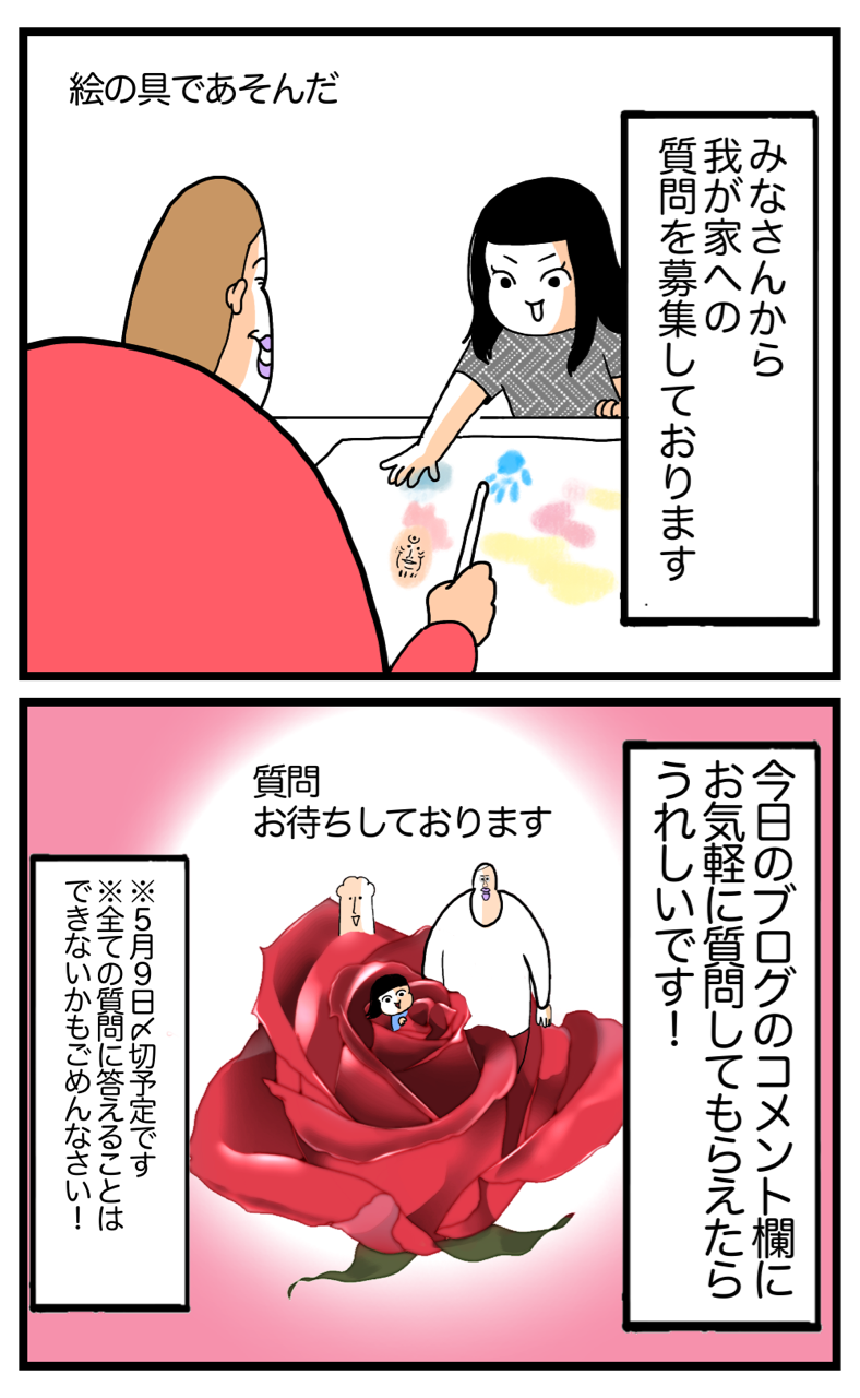 2021/05/06 🌹ゴールデンウイーク&お知らせ🌹 詳細はまだお話できませんが質問いただけると嬉しいです🌹 「お知らせ」カテゴリの最新記事 < 前の記事次の記事 > コメント コメント一覧 (309) 前のコメントを読み込むためにはJavaScriptを有効にしてください。 読み込み中 208. 清水カズユキ 2021/05/06 18:49 われ、何するん。楽しみー! 0 boobooboopiyo がしました 209. kazushimi0724 2021/05/06 18:51 われ、何するん?楽しみー。 0 boobooboopiyo がしました 210. ほうじ茶 2021/05/06 18:59 いつも楽しみにしています! 既に同じような質問が出ていますが、 どうしたらガクちゃんみたいな ステキなセンスと優しさを持った 子になるのかをお聞きしたいです! 0 boobooboopiyo がしました 211. あみこ 2021/05/06 19:33 いつも楽しく拝見して、いつも元気を貰ってます!☺️ これからもブログ楽しみにしてますね♪ 質問 ・ブブさんの働いた事のあるアルバイトは?またそこでの失敗談とかあれば聞いてみたいです ・ストレス発散法を絵で見たいです笑 ・ブログによく出るお友達さんの絵が可愛すぎて…ブブさんが本気で描くめっちゃ可愛い女の子が見たいです! 0 boobooboopiyo がしました 212. じろこ 2021/05/06 19:39 ご夫婦の馴れ初めがしりたいです! 0 boobooboopiyo がしました 213. ゆぴんたん 2021/05/06 19:49 ぶぶさんのがくちゃんへの最大級の愛情表現はなんですか?(*^^*) 0 boobooboopiyo がしました 214. 営業車よりBIGLOVEを込めて 2021/05/06 19:52 質問です。 ちょいちょいブブさん作詞の曲が登場してますが、影響をウケた音楽はなんですか? やっぱり北斗ですか?聖闘士星矢ですか? いつも楽しみにしてます! お身体に気をつけてこれからもガクちゃんの成長を覗かせてください! 0 boobooboopiyo がしました 215. さんまんご 2021/05/06 19:57 ぶぶさん、三原のご出身でしたよね?私も広島出身なので勝手に親近感。 三万石せんべいご存知ですか?私的にベストオブ広島銘菓なのでPRしてほしい! 0 boobooboopiyo がしました 216. 名無し 2021/05/06 19:58 企画楽しみです〜 質問です。ペットを飼う予定はないのでしょうか🐈🐕 0 boobooboopiyo がしました 217. 推しに会いたい 2021/05/06 20:03 いつもブログ楽しく拝見させていただいてます! 私は結婚もしていないですが、素敵な家族で楽しそうだなあとにっこりしてます☺️ ぶぶさんは負の感情に襲われることはないですか? 怒りとか悲しいとか悔しい、、とか🙄 もしぶぶさんにもあるなら 乗り越えた方、対処法を教えていただきたいです! よろしくお願いします🥺 0 boobooboopiyo がしました 218. ヨダ 2021/05/06 20:09 ブログ更新いつも楽しみにしています! 質問…ブブ家の独特なルールはありますか? 0 boobooboopiyo がしました 219. ゆきの 2021/05/06 20:11 がくちゃんは何故そんなに可愛いのですか? 0 boobooboopiyo がしました 220. アンドロメダ 2021/05/06 20:15 いつも楽しく拝見しています♪ 妊娠中や出産の時に何かハプニングやおもしろい出来事はありましたか? 0 boobooboopiyo がしました 221. まりこ 2021/05/06 20:22 いつも楽しく拝見させてもらっています❤ 質問…今、絶賛便秘中なのですが、ブブさんの便秘解消法は?(笑) 0 boobooboopiyo がしました 222. つめかえバナナ 2021/05/06 20:33 いつも楽しく拝見してます! スタンプも愛用してます!みんなに好評です❤️ 尊敬する人は誰ですか??お聞きしたいです! 0 boobooboopiyo がしました 223. ちまこ 2021/05/06 20:35 いつも更新楽しみにしてます♡ 質問なのですが‥ 3歳の息子がおります。 36歳の旦那がおります イライラしちゃうことが多くて、自分が嫌になっちゃいます。 イライラしたときの対処法おしえてくださーい! 0 boobooboopiyo がしました 224. emily 2021/05/06 20:40 いつも、楽しく読ませてもらってます🥺 毎日、家事育児イラストと、 お疲れ様です☺️ ぶぶさんのストレス発散方法を教えてください! 0 boobooboopiyo がしました 225. ぶぶさんだいすきまん 2021/05/06 20:43 毎回楽しませてもらっております いつもありがとうございます 質問:ぶぶさんのオススメのお菓子は何でしょうか これからの季節、おすすめのアイスも聞きたいですね 旦那さまのオススメ、がくちゃんのオススメもあったら聞かせてくださいな♪ 私はチョコミント系に弱く、ソフトクリームが好きです 娘はバニラシェイクが好きです(19歳 0 boobooboopiyo がしました 226. ぬぴ 2021/05/06 20:55 いつも楽しく拝見しております!!! 台湾パイナップル。。。🍍気になります(笑) 質問ですが、子どもの行事?イベントなどどのようにしてますか?? 娘が生まれる頃にコロナが流行りだしたのもあって、外出もできず祖父母を交えずに家族3人お家でお祝いなどをしました! 飾り付けとかが苦手で気持ちで乗りきってますが、将来娘が動画や写真を見たときに寂しがらないかなと思いまして。 もし良かったら参考にさせていただきたいです✨ 0 boobooboopiyo がしました 227. n 2021/05/06 20:57 ぶぶという名前はどこからついたのですか 0 boobooboopiyo がしました 228. はじめまして 2021/05/06 21:01 初めてのコメントですが、ずっと前からいつも楽しみに見ていま