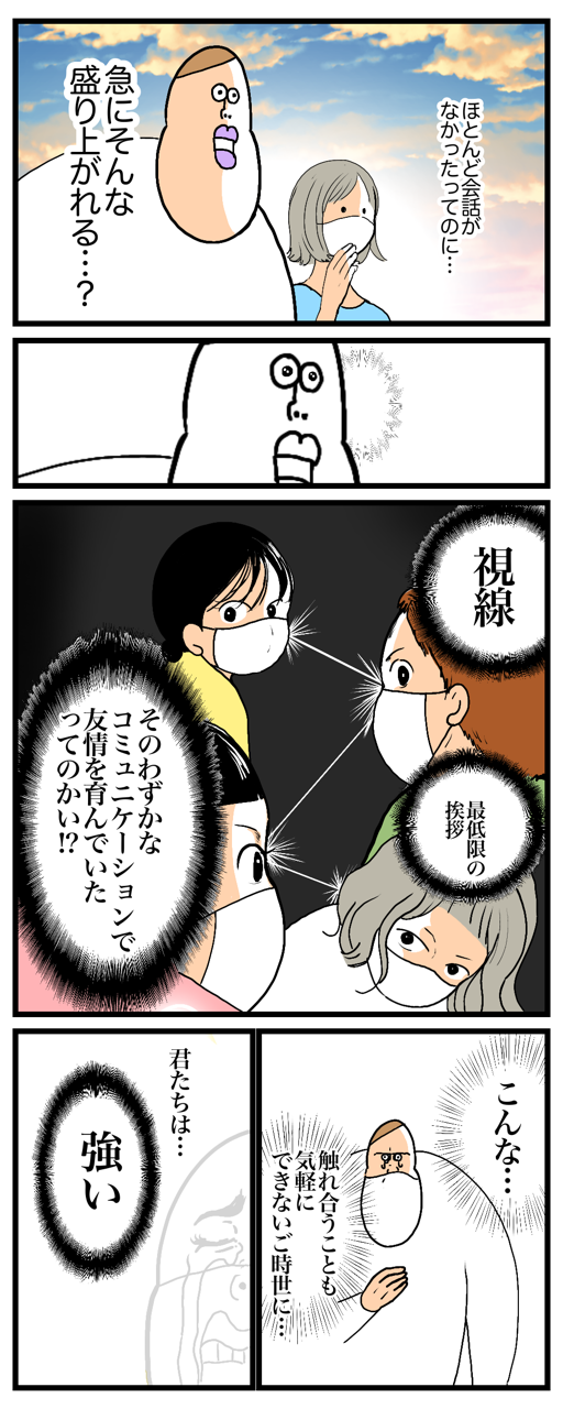 マスクがあったって、思うように喋れなくたって、ガクちゃんたちのように、みんなわずかなコンタクトを積み重ねて絆を育んでいるんだと思うと、なんだかジーンとしてしまう…